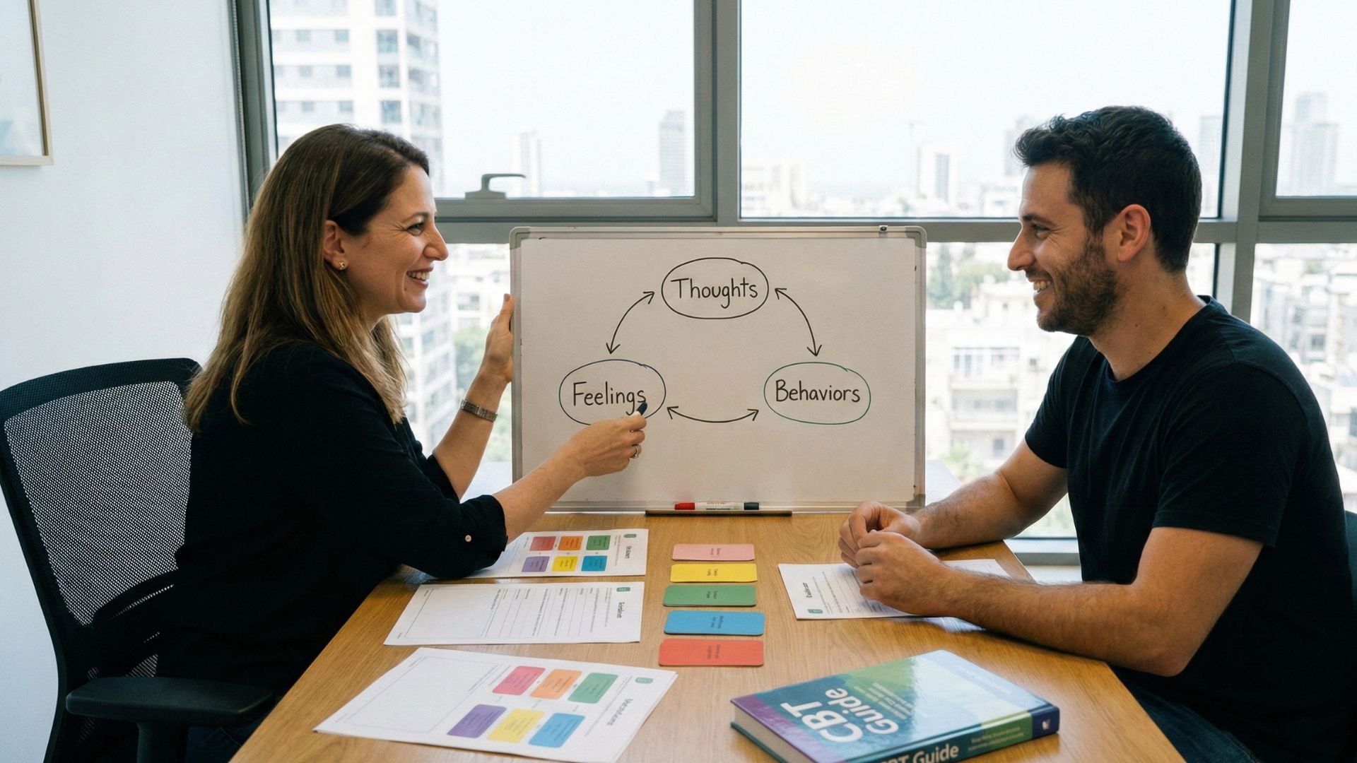 החדשות הטובות הן שאפשר "לתכנת" את המחשבה מחדש. טיפול CBT (טיפול קוגניטיבי-התנהגותי) במכון דרור הוא טיפול ממוקד מטרה ותכליתי. בניגוד לטיפולים אחרים שעוסקים רבות בעבר, כאן אנחנו מתמקדים ב"כאן ועכשיו" – איך פותרים את הבעיה שמפריעה לכם היום. השיטה עובדת על שני צירים משולבים: